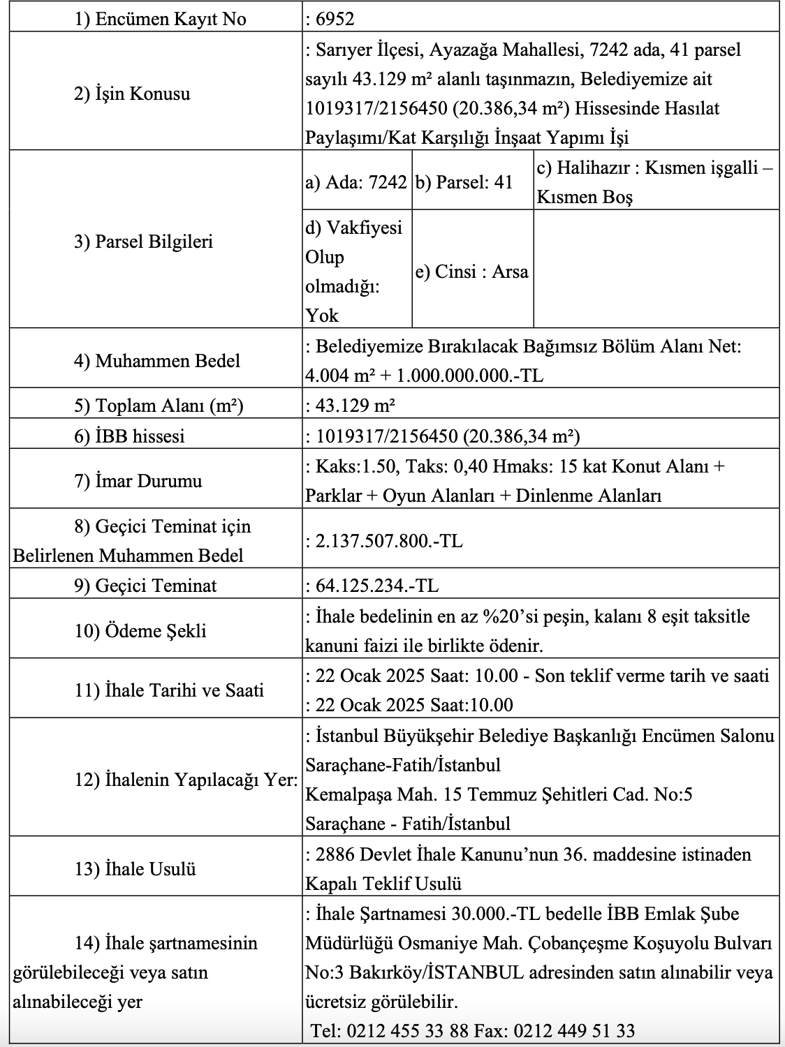 İstanbul Büyükşehir Belediyesi, İstanbul Sarıyer Ayazağa’daki 7242 ada, 41 parsel için ihaleye çıkıyor. Bugünkü 32775 Sayılı Resmi Gazete’de yayımlanan ihale ilanına göre İBB, 43 bin metrekarelik parseldeki 20 bin 386 metrekarelik hissesi için kat karşılığı inşaat ihalesi düzenliyor.