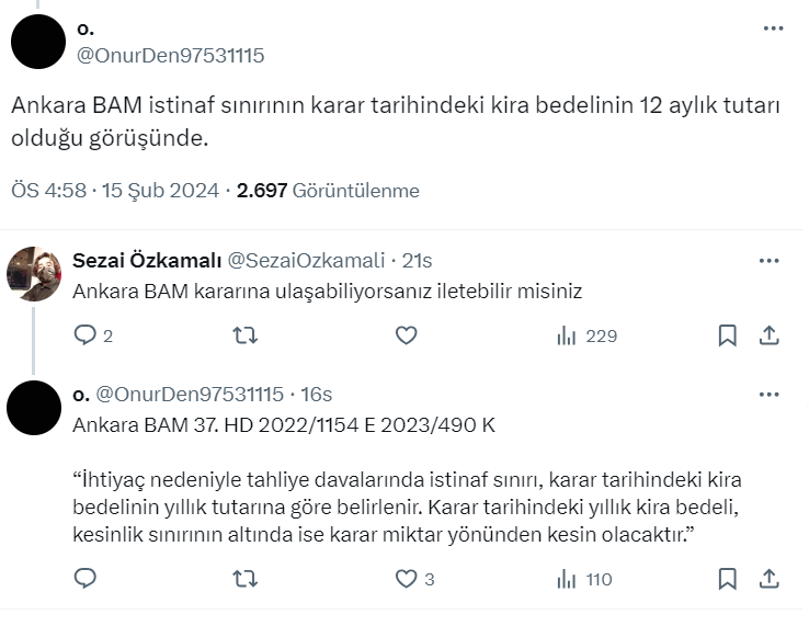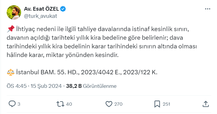 Sosyal medya hesabı üzerinden ev sahibi ve kiracı hakları ile ilgili olarak yaptığı paylaşımlarla dikkat çeken ve hem ev sahipleri hem de kiracılar tarafından yakından takip edilen Avukat Esat Özel, resmi X hesabı https://twitter.com/turk_avukat üzerinden yaptığı paylaşımda ihtiyaç nedeniyle tahliye davalarında yıllık kira bedeli detayına dikkat çekti.
