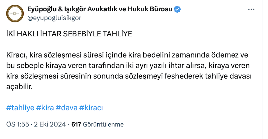 Eyüpoğlu - Işıkgör Avukatlık ve Hukuk Bürosu resmi sosyal medya hesabı üzerinden yaptığı paylaşımda iki haklı ihtar sebebiyle tahliyenin detaylarını açıkladı. İşte o paylaşım…
