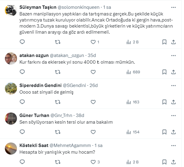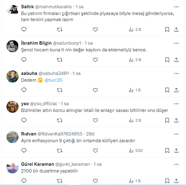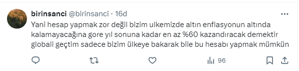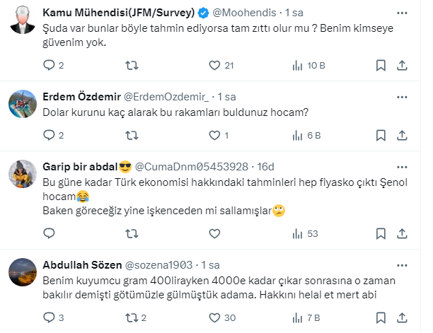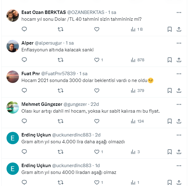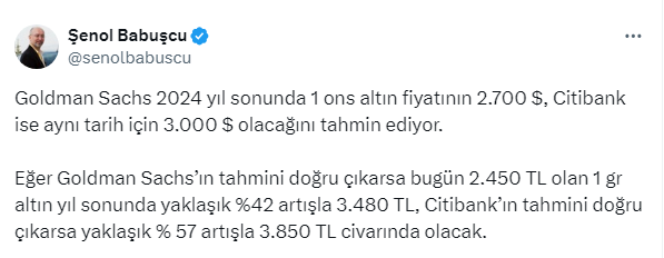 Babuşçu paylaşımında şunları söyleri: “Goldman Sachs 2024 yıl sonunda 1 ons altın fiyatının 2.700 $, Citibank ise aynı tarih için 3.000 $ olacağını tahmin ediyor. Eğer Goldman Sachs’ın tahmini doğru çıkarsa bugün 2.450 TL olan 1 gr altın yıl sonunda yaklaşık %42 artışla 3.480 TL, Citibank’ın tahmini doğru çıkarsa yaklaşık % 57 artışla 3.850 TL civarında olacak.”