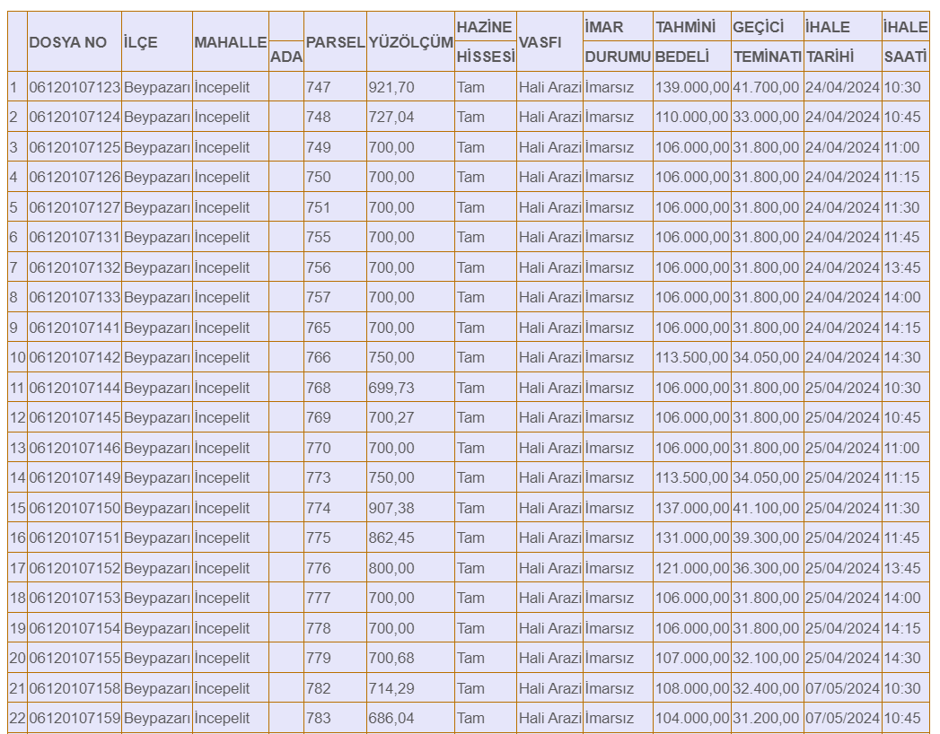 Ankara ve Diyarbakır'da yer alan 38 arazi ile 1 konut için satış ihalesi düzenleniyor. Ankara Beypazarı'nda yer alan arazilerin satış bedelleri 104 bin TL ile 303 bin TL arasında değişiyor.
