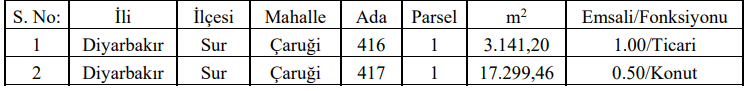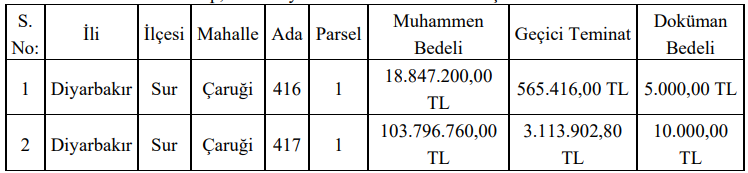 Diyarbakır'da yer alan arsaların ise muhammen bedelleri 18 milyon 547 bin 200 TL ve 103 milyon 796 bin 760 TL olarak açıklanırken geçici teminat bedelleri de 565 bin 416 TL ile 3 milyon 113 bin 902 TL olarak açıklandı.