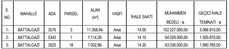 Kapalı teklif usulü ile satışa çıkan Battalgazi Mahallesindeki arsa vasıflı gayrimenkullerin