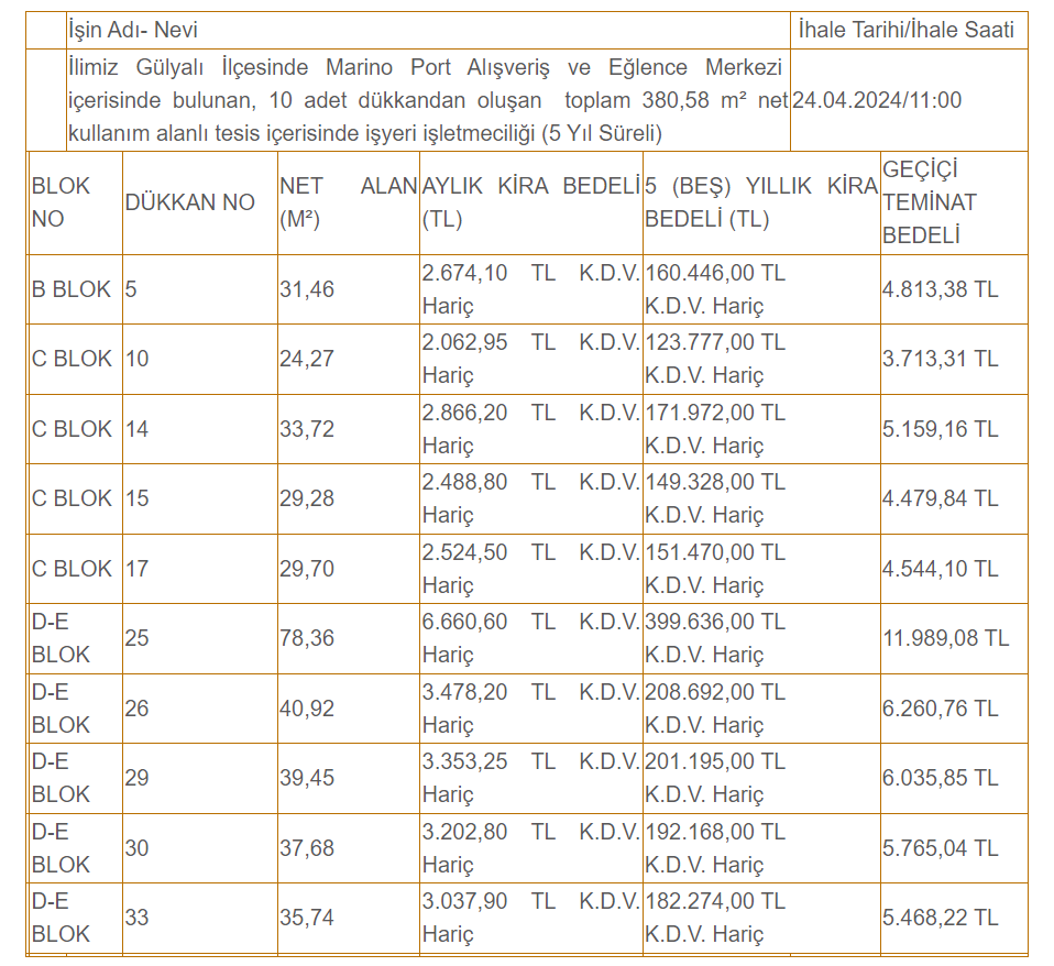 Orkent İnşaat İmar Sanayi Ve Ticaret A.Ş.’nin görev, yetki ve sorumluluk alanı içerisinde kalan İlimiz Gülyalı İlçesinde Marino Port Alışveriş ve Eğlence Merkezi içerisinde bulunan, 10 adet işyerinden oluşan toplam 380,58 m² net kullanım alanlı alışveriş ve eğlence merkezi içerisindeki işyeri işletmeciliği, 2886 Sayılı Devlet İhale Kanununun 45. maddesi gereğince Açık Teklif usulü ile 5 yıl süre ile kiraya verilmek üzere ihaleye çıkartılmıştır.