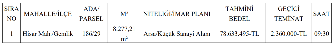 1- Gemlik Belediyesinin mülkiyetinde bulunan aşağıda tapu kaydı ve nitelikleri belirtilen