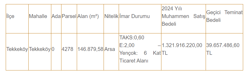 Samsun'da yer alan ticaret alanı imarlı arsanın ise muhammen bedeli 1 milyon 231 bin 916 bin 220 TL, geçici teminat bedeli ise 39 milyon 657 bin 486 TL olarak açıklandı.