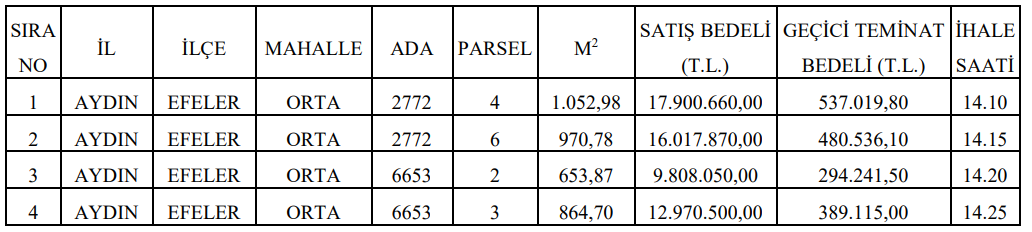 Aydın ve Aksaray'da yer alan 10 adet gayrimenkul için satış ihalesi düzenleniyor. Aydın Efeler'de yer alan gayrimenkullerin satış bedelleri 9 milyon 808 bin 50 TL ile 17 milyon 900 bin 660 TL arasında değişirken, geçici teminat bedelleri ise 294 bin 241 TL ile 537 bin 19 TL arasında değişiyor.