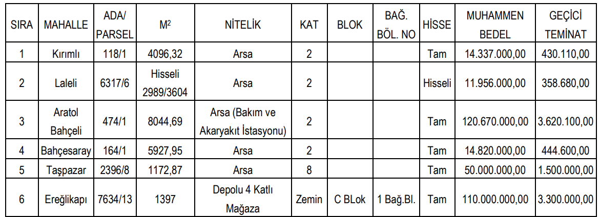 2- İhale konusu taşınmazlara ait toplam muhammen bedel ve geçici teminat miktarı şu