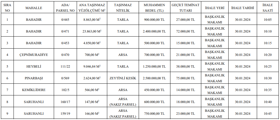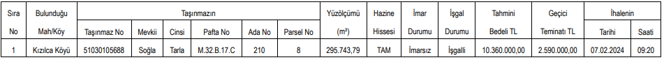 NOT: Türkiye genelindeki ihale bilgileri www.milliemlak.gov.tr internet adresinden öğrenilebilir.