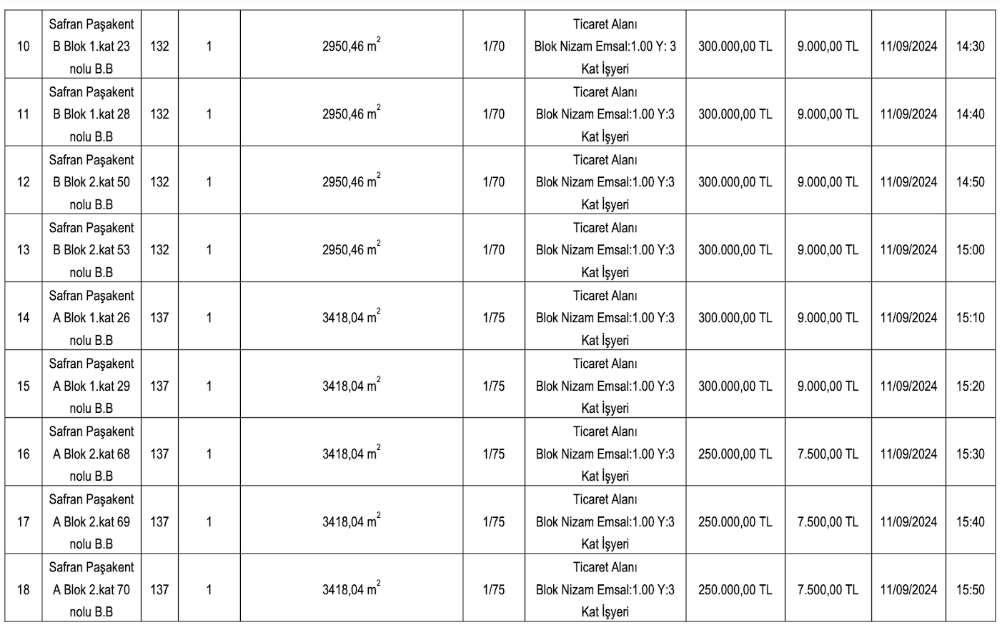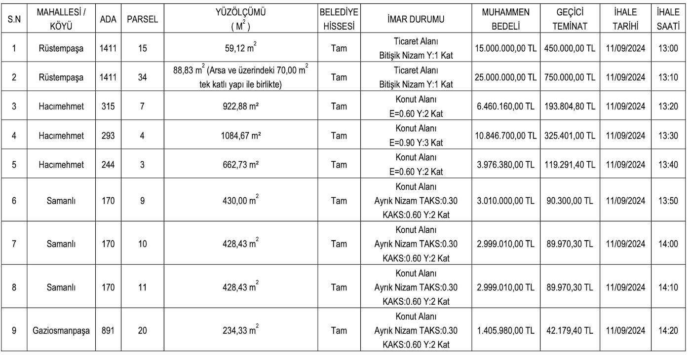 Arsa ve iş yerlerinin satış ihalesi 11 Eylül 2024 tarihinde saat 13.00 ve 15.50 arasında yapılacak.
