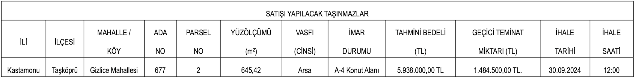 Kastamonu Çevre Şehircilik ve İklim Değişikliği İl Müdürlüğü Taşköprü Milli Emlak Şefliği satışa çıkarılan arsanın tahmini satış bedeli 5 milyon 938 bin TL, geçici teminat bedeli ise 1 milyon 484 bin 500 TL şeklinde açıklandı. Arsanın satış ihalesi 30 Eylül 2024 tarihinde saat 12.00’de yapılacak.