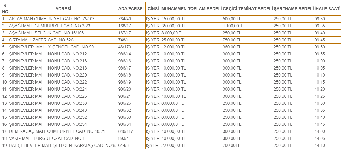 Mülkiyeti Belediyemize ait aşağıdaki tabloda yer alan ilçemiz değişik yerlerinde bulunan taşınmazları Belediyemiz gelirlerine katkısı olması nedeni ile 2886 sayılı Devlet İhale Kanununun 45. maddesine istinaden acık arttırma suretiyle kiraya verilecek ve 2886 sayılı Devlet İhale Kanununun 45. maddesine istinaden acık arttırma suretiyle ticari arsalar satılacaktır.