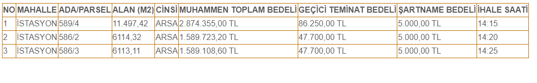3- Mülkiyeti Belediyemize ait aşağıdaki tabloda yer alan ilçemiz İstasyon mah. bulunan taşınmazları Belediyemiz gelirlerine katkısı olması nedeni ile 2886 sayılı Devlet İhale Kanununun 45. maddesine istinaden acık arttırma suretiyle ticari arsalar satılacaktır.