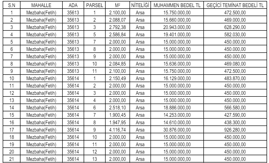 1- Mülkiyeti Belediyemize ait aşağıda tapu kayıtları ve muhammen bedeli yazılı