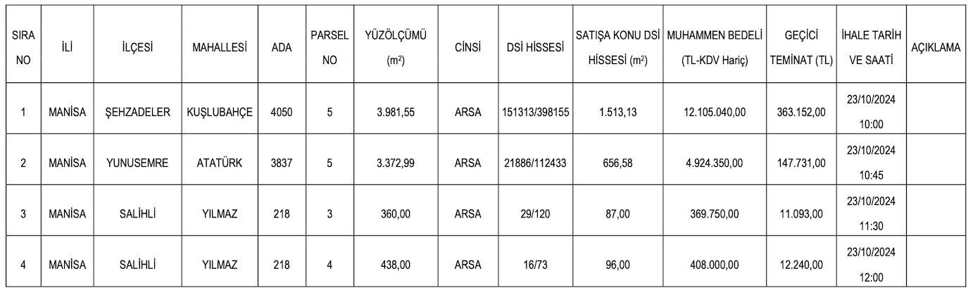 DSİ İzmir 2. Bölge Müdürlüğü tarafından satışa çıkarılan ve Manisa’da yer alan arsaların en düşük muhammen bedeli 369 bin 750 TL olarak, en yüksek muhammen bedeli ise 12 milyon 105 bin 40 TL şeklinde açıklandı. Merakla beklenen satış ihalesi 23 Ekim’de yapılacak.