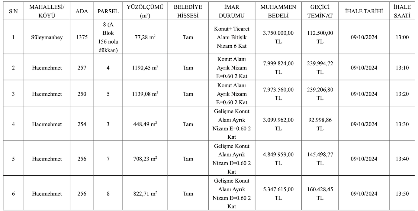 Yüz ölçümlerinin 59,12 metrekare ile 2 bin 950 metrekare arasında değiştiği arsaların satış ihalesi 9 Ekim 2024 tarihinde saat 13.10 ile 16.20 arasında, iş yerinin satış ihalesi ise saat 13.00’te yapılacak.