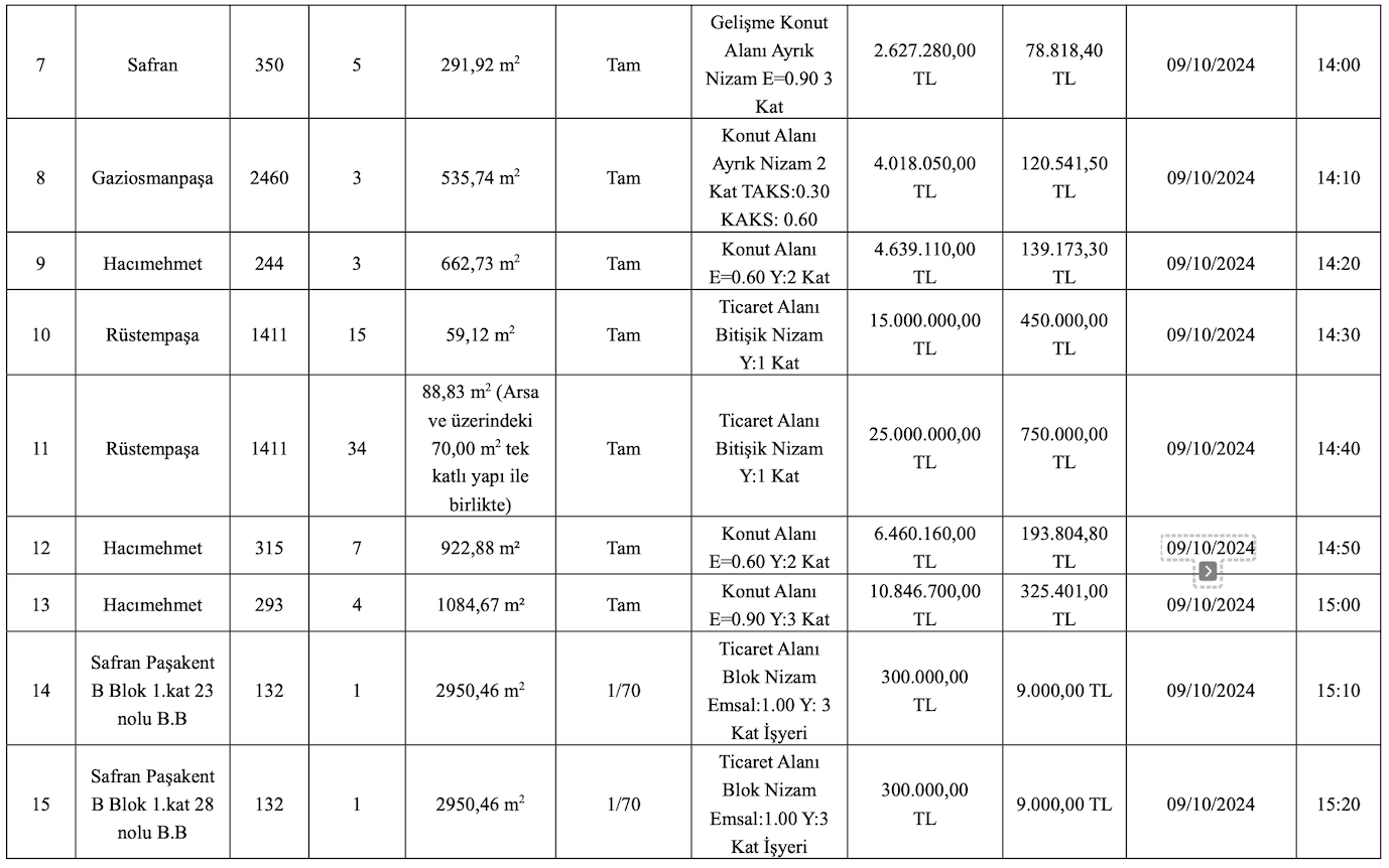 Hacımehmet, Safran, Gaziosmanpaşa, Rüstempaşa ve Fevziçakmak mahallelerinde yer alan arsaların muhammen bedelleri ise 300 bin TL ile 25 milyon TL arasında değişirken, geçici teminat bedelleri ise 9 bin TL ile 750 bin TL arasında değişiyor.