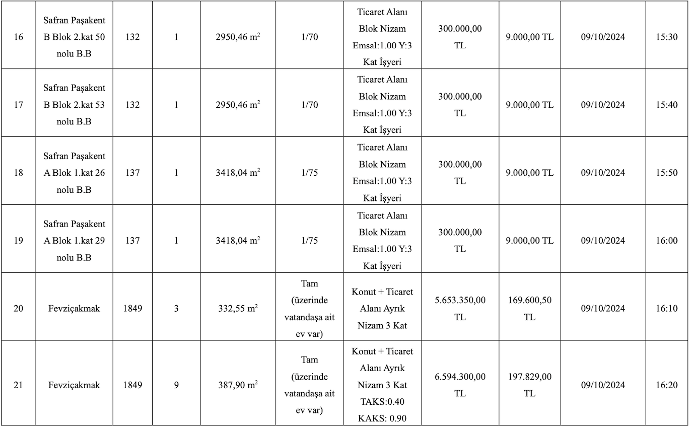 21 adet arsa ve iş yerinin satış ihalesi 9 Ekim 2024 tarihinde gerçekleştirilecek.