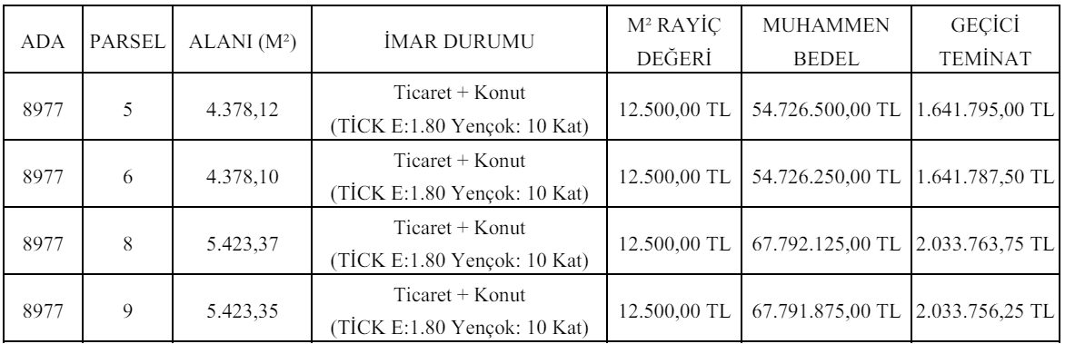 alanı, imar durumu, m² rayiç bedeli, muhammen bedeli ve geçici teminat tutarı belirtilen