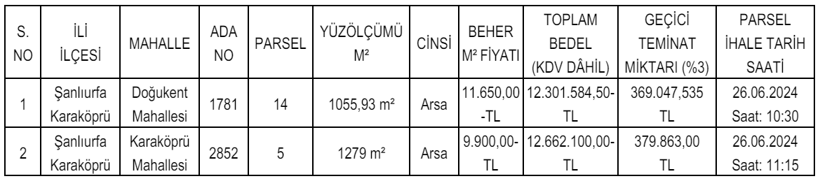 Şanlıurfa'da yer alan arsaların ise muhammen bedelleri 12 milyon 301 bin 584 TL le 12 milyon 662 bin 100 TL arasında değişirken, geçici teminat bedelleri ise 369 bin 47 TL ile 379 bin 863 TL arasında değişiyor.