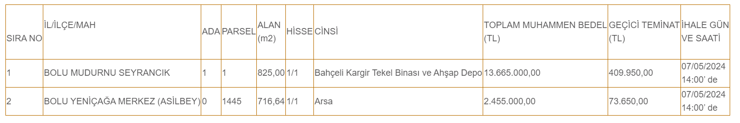 Bolu ve Amasya'da yer alan arsa, arazi ile kargir bina satışa çıkarıldı. Gayrimenkullerin satış ihaleleri 3 Mayıs ve 7 Mayıs tarihlerinde yapılacak.