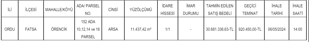 Karayolları Genel Müdürlüğü tarafından satışa çıkarılan ve Ordu Fatsa'da yer alan arsanın satış bedeli 30 milyon 681 bin 336 TL, geçici teminat bedeli ise 920 bin 450 TL olarak açıklandı.