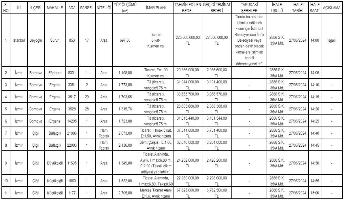 İzmir ve Konya'da yer alan 12 arsa ile arazi için satış ihalesi düzenleniyor. Yatırımcıların merakla beklediği satış ihaleleri 25 Haziran ve 27 Haziran'da yapılacak.