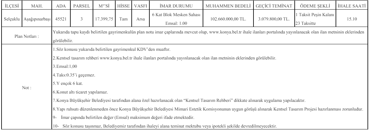 2- İhale, 25.06.2024 Salı günü Belediye Encümeni tarafından Konevi Mh. Millet Cd. A Blok No:14 Meram/KONYA adresindeki Büyükşehir