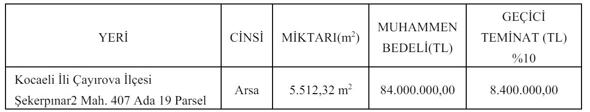 Kocaeli ve Bolu'da yer alan iki adet arsa için satış ihalesi düzenleniyor. Kocaeli Çayırova'da yer alan 5 bin 512 metrekare alana sahip arsanın muhammen bedeli 84 milyon TL, geçici teminat bedeli de 8 milyon 400 bin TL olarak açıklandı. 4 taksit imkanı sağlanan arsanın satış ihalesi 17 Temmuz'da yapılacak.