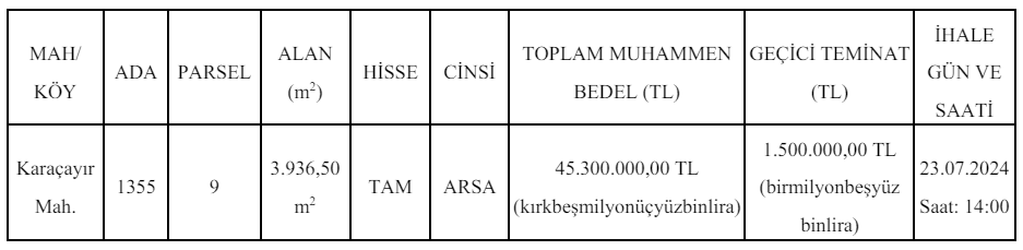 Bolu'da yer alan 3 bin 936 metrekare alana sahip arsanın muhammen bedeli 45 milyon 300 bin TL, geçici teminat bedeli ise 1 milyon 500 bin TL olarak açıklandı. Satış ihalesi 23 Temmuz tarihinde yapılacak.