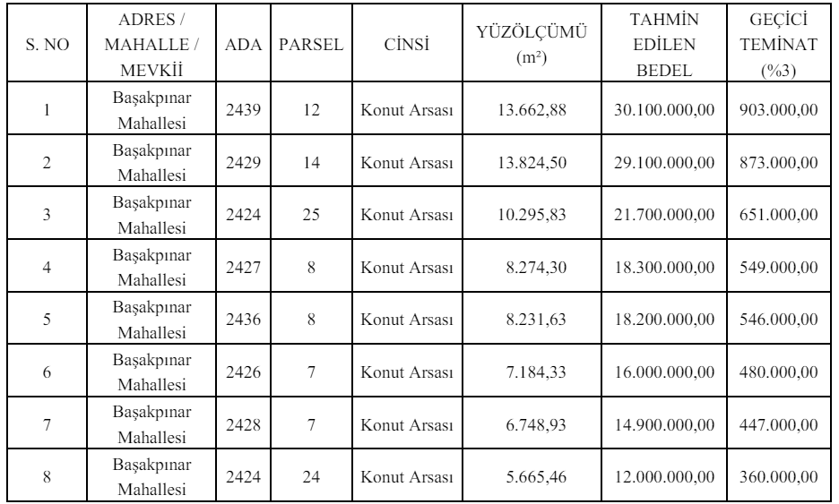Mülkiyeti veya tasarruf hakkı Belediyemize ait aşağıda özellikleri belirtilen taşınmazlar