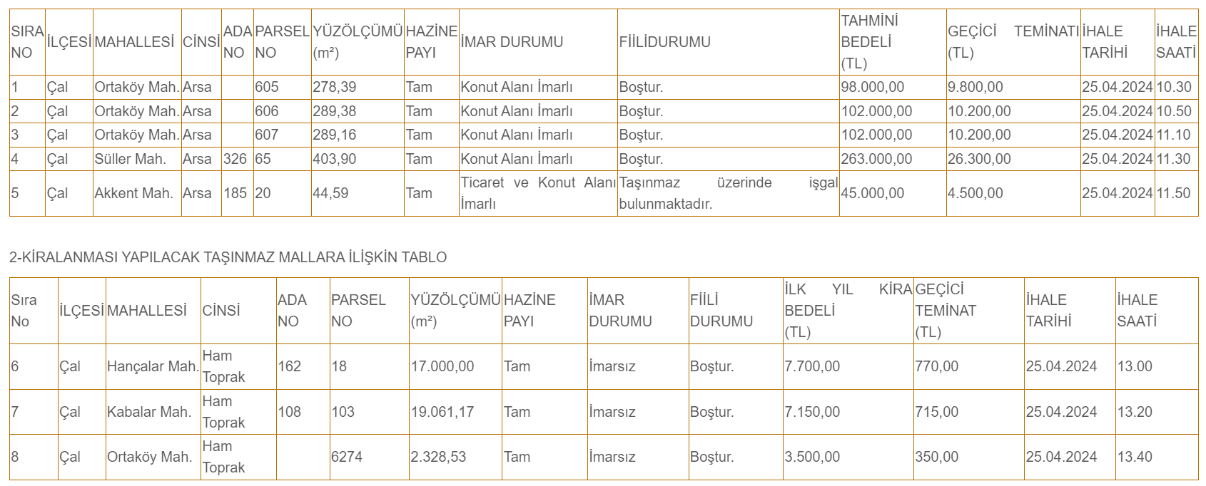 Çal Milli Emlak Şefliğince 8 adet taşınmazın satışı ve kiralaması yapılacaktır