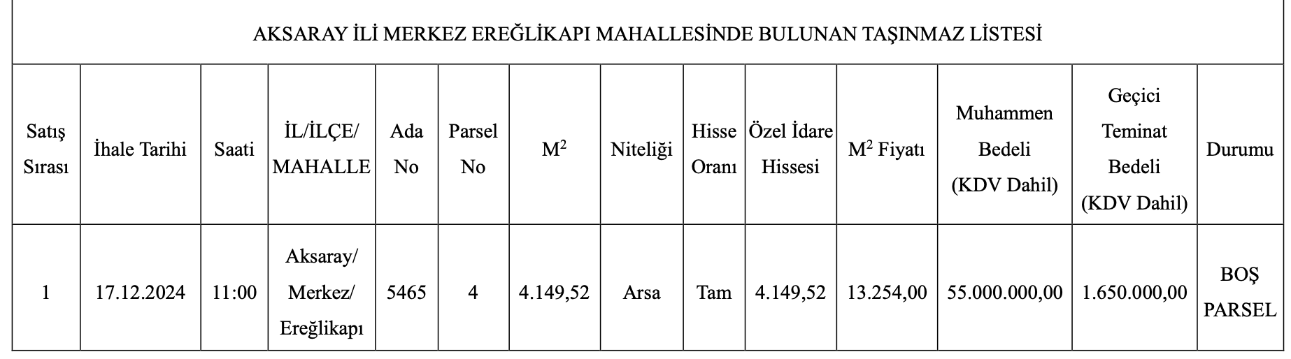 Arsanın satış ihalesi 17 Aralık 2024 tarihinde saat 11.00’de Aksaray İl Özel İdaresi toplantı salonunda İl Encümeni tarafından yapılacak.