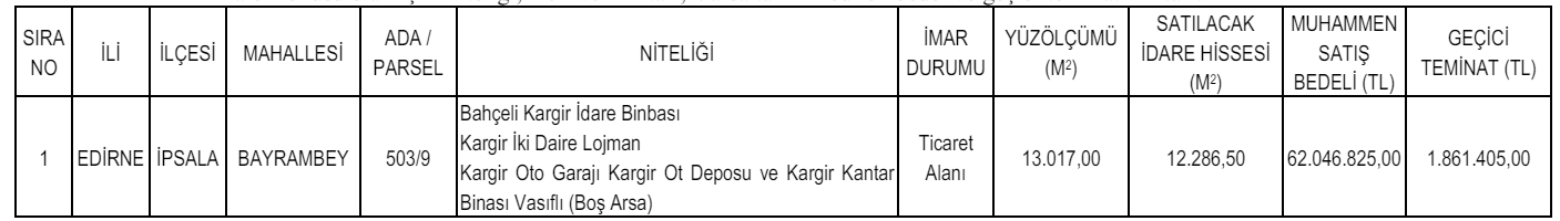 Edirne İl Özel İdaresine ait aşağıda bilgileri bulunan taşınmaz 2886 sayılı Devlet İhale Kanunu’nun 35/a maddesi uyarınca “Kapalı Teklif Usulü ” ile