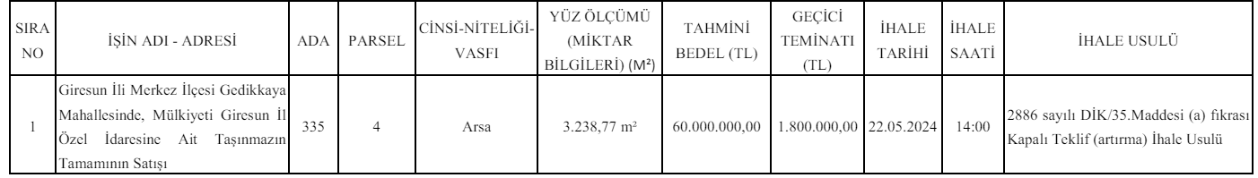 Mülkiyeti Giresun İl Özel İdaresine Ait 1 (bir) Adet Taşınmazın Satışı İhalesi Yapılacaktır.