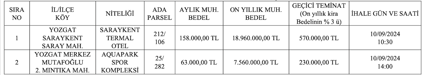 Mülkiyeti İdaremize ait İlimiz Merkez İlçesi Mutafoğlu 2. Mıntıka Mahallesi 25 ada 282 parsel numaralı taşınmaz üzerinde bulunan Kadınlar Aquapark Spor Kompleksi tesisleri ile İlimiz Saraykent İlçesi Saray Mahallesi 212 ada 106 parsel numarasında bulunan Saraykent Termal Otel Tesisi 2886 sayılı Devlet İhale Kanunu’nun 37. maddesi uyarınca “Kapalı Teklif Usulü” ile kiralanacaktır.