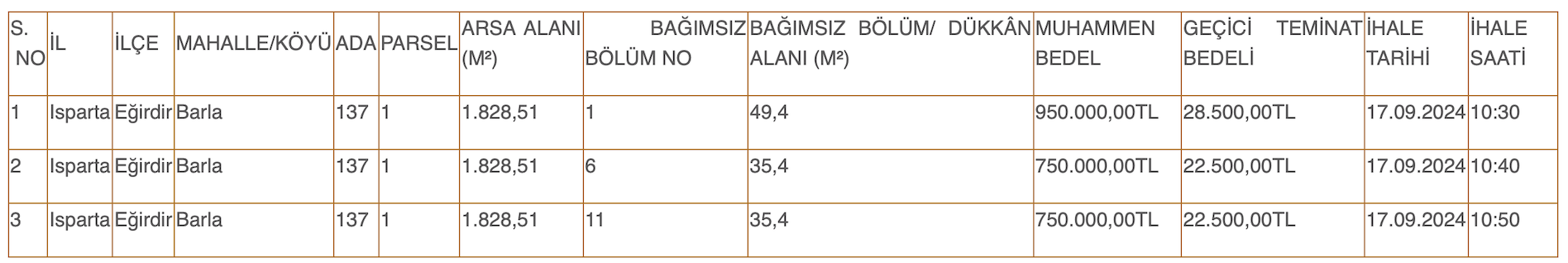 Isparta İl Encümeni Başkanlığı da Isparta Eğirdir’de yer alan üç adet iş yerini satışa çıkardı. Yüz ölçümleri 49,4 ve 35,4 metrekare olarak açıklanan iş yerleri Barla’da yer alıyor.