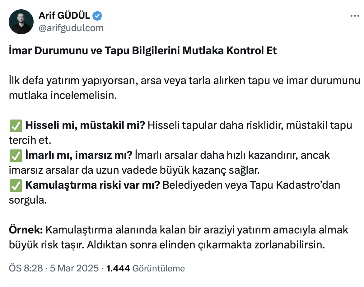 Arif Güdül resmi sosyal medya hesabı https://twitter.com/arifgudulcom üzerinden yaptığı paylaşımda ilk defa arsa ve arazi alacaklar için önemli uyarılar yaptı.