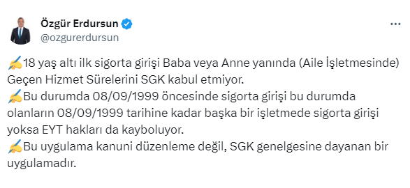 Sosyal Güvenlik Uzmanı Özgür Erdursun https://x.com/ozgurerdursun X sosyal medya hesabından yaptığı paylaşımda, ilk sigorta girişi 18 yaş altında olanların bilmesi gerekenleri anlattı.