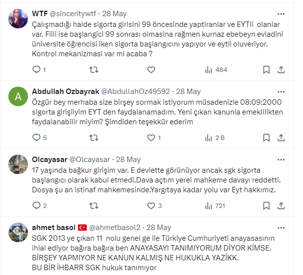 - Bu durumda 08/09/1999 öncesinde sigorta girişi bu durumda olanların 08/09/1999 tarihine kadar başka bir işletmede sigorta girişi yoksa EYT hakları da kayboluyor.