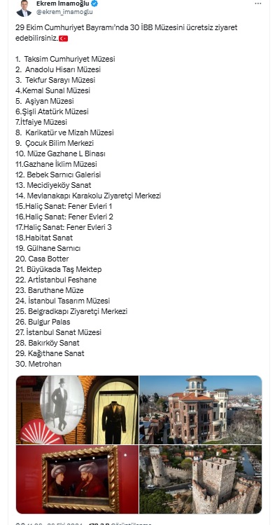 İmamoğlu duyurdu! Cumhuriyet Bayramı'nda ücretsiz gezebileceğiniz 30 müze