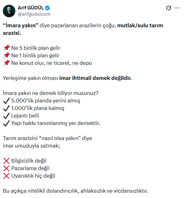 Toprak Yatırımcısı ve talepbul'un Yönetim Kurulu Başkanı Arif Güdül resmi sosyal medya hesabı üzerinden yaptığı paylaşımda 'imara yakın' diye satılan arazilere karşı yatımcıları uyarıyor.