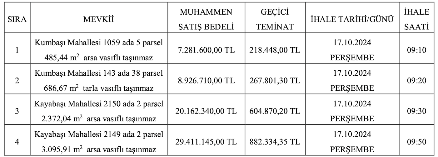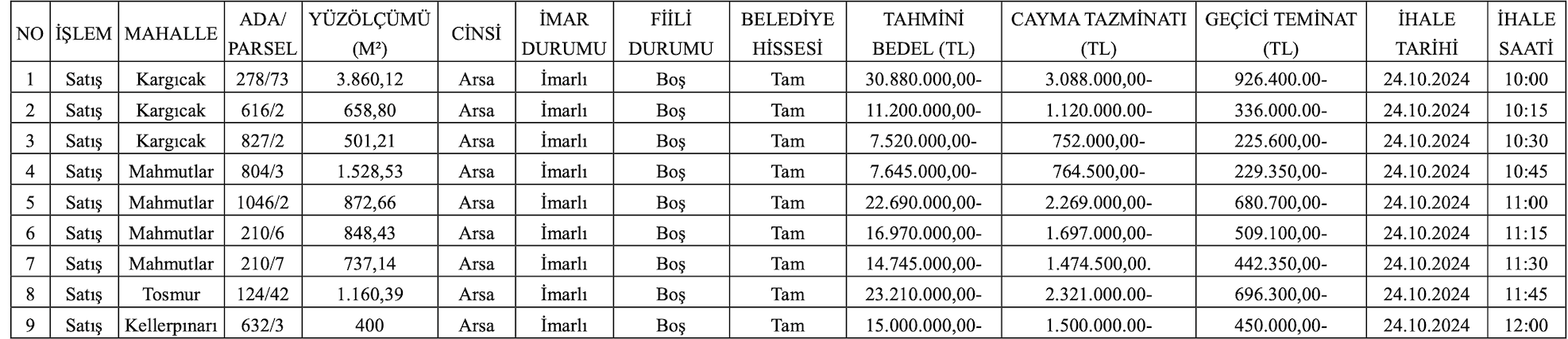 Kargıcak, Mahmutlat, Tosmur ve Kellerpınarı mahallelerinde yer alan arsaların muhammen bedelleri 7 milyon 520 bin TL ile 30 milyon 880 bin TL arasında değişirken, geçici teminat bedelleri de 229 bin 350 TL ile 926 bin 400 TL arasında değişiyor.