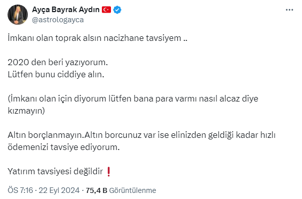 2020 yılından beri toprak yatırımının önemine vurgu yaptığını söyleyen Araştırmacı-Yazar Ayça Bayrak Aydın, sosyal medya hesabından altınla ilgili de dikkat çekici açıklamalarda bulundu.