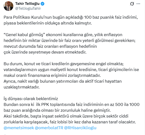 Tahir Tellioğlu sosyal medya hesabından faiz indiriminin en az 500 ila 1000 baz puan arasında olması gerektiğini aksi halde inşaat sektörü olmak üzere birçok sektörün ciddi zorluklarla karşılaşacacağını vurguladı.