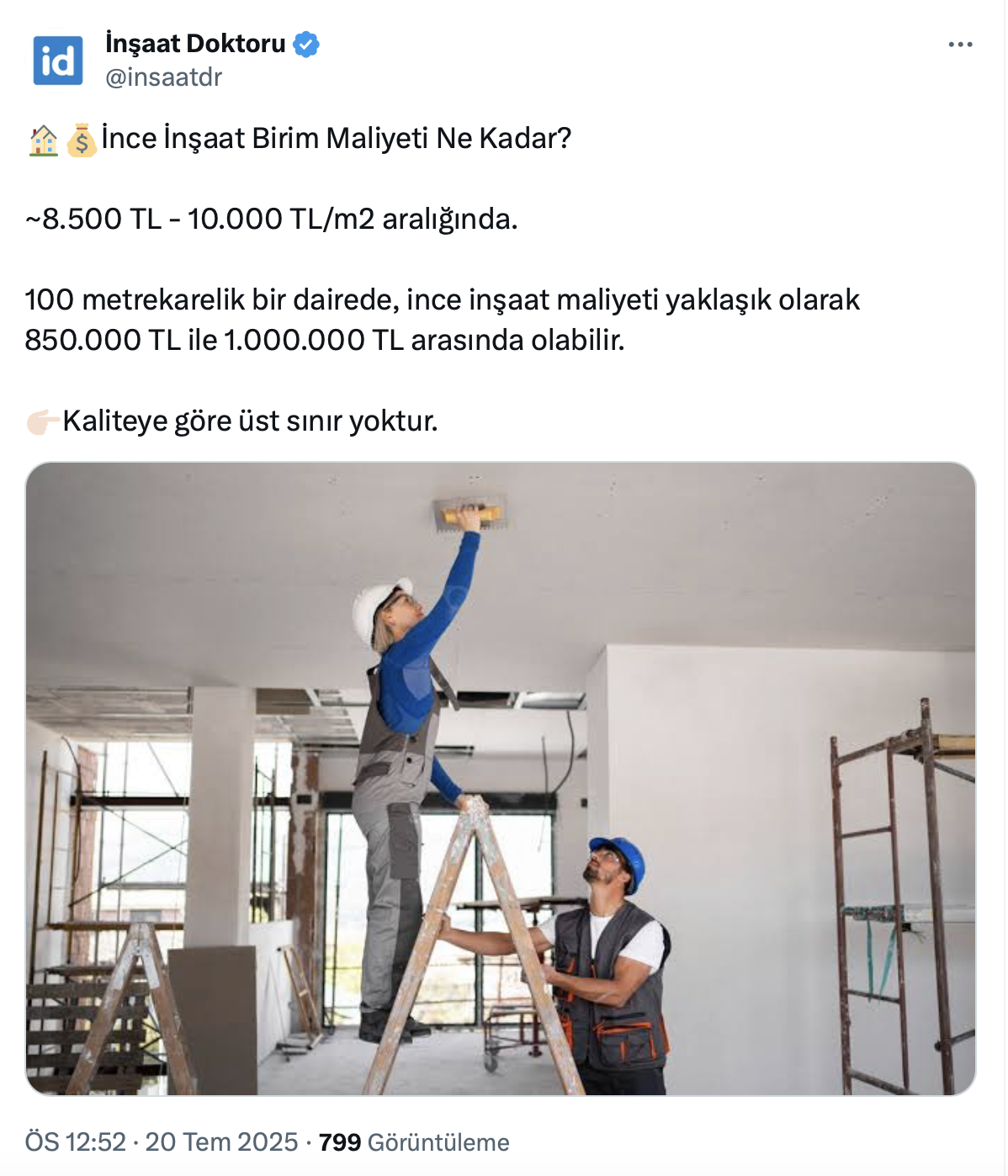 İnşaat ve konut sektörü ile ilgili yaptığı paylaşımlarla dikkat çeken 53,7 bin takipçili İnşaat Doktoru resmi X hesabı https://twitter.com/insaatdr üzerinden bu kez ince inşaat birim maliyeti ile ilgili bir paylaşım yaptı.
