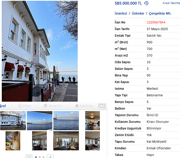 Çengelköy'de, İnci Bosphorus'un yer aldığı, Boğaz’ın kıyısında tarih kokan Tüfekci Alaaddin Bey Yalısı, 585 milyon TL'ye satılıyor.