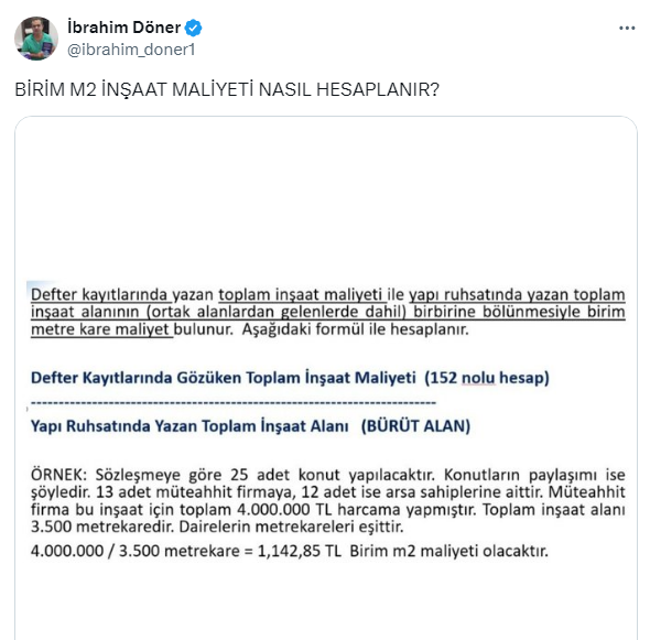 Mali Muşavir İbrahim Döner, sosyal medya hesabından inşat maliyetini bir örnekle hesapladı. İşte İnşaat birim metrekare maliyeti ...