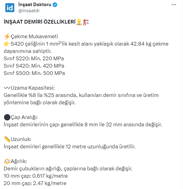İnşaat doktoru sosyal medya hesabı X'ten inşaat demirinin özelliklerini açıkladı. İşte 8 mm ve 32 mm inşaat demiri özellikleri...