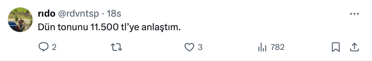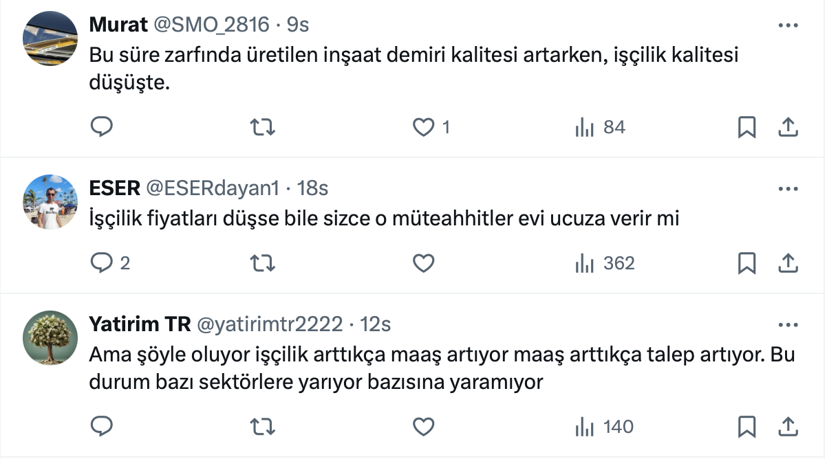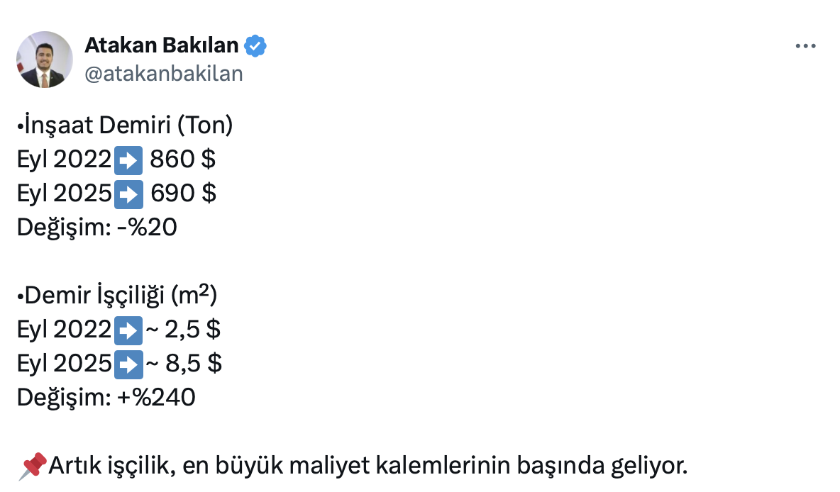 Atakan Bakılan yaptığı paylaşımda a inşaat demiri fiyatları yüzde 20 düşerken, demir işçiliği fiyatlarının yüzde 240 arttığını söyledi.